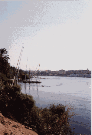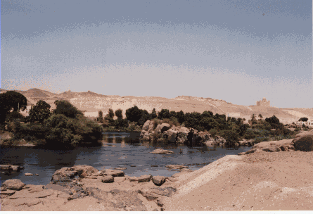 Le Nil derrière Elephantine avec le Mausolée de l'Aga Khan et Saint Siméon.