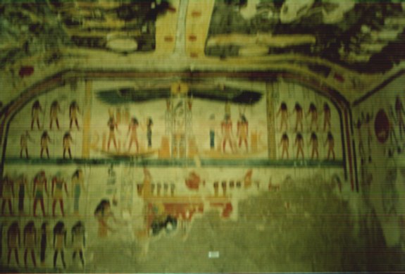 C'est très difficile de prendre des photos des tombes. Le flash est, justement, interdit afin de préserver les couleurs vieilles de 4000 ans (bien que certains soient très fiers de prendre des photos après avoir glisser un billet au garde). Les longs corridors qui conduisent aux chambres sont décorées tant sur les murs qu'aux plafonds d'un foisonnement de peintures symboliques et magiques qui doivent soient accompagner (Livre des morts) le défunts, soit repousser les mauvais génies. C'est très difficile de n'en prendre qu'un détail.